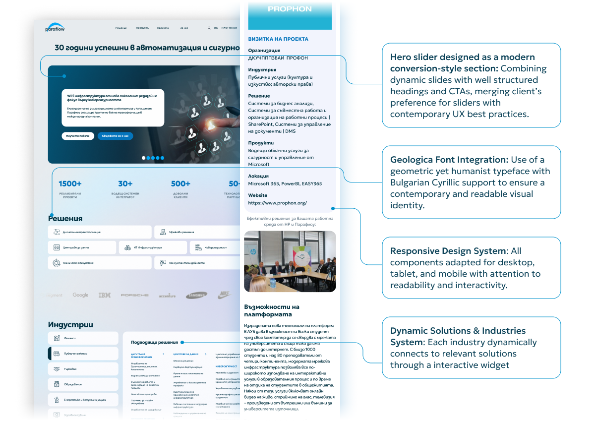 Проектът изискваше балансиране на две еднакво важни предизвикателства. Първо, трябваше да проектираме гъвкава, но визуално консистентна архитектура на съдържанието, която да позволява на клиента самостоятелно да управлява множество взаимосвързани типове съдържание (решения, индустрии, проекти и продукти) чрез custom административен панел. Системата трябваше да бъде интуитивна, скалируема и с консистентна визуална структура на всички устройства. Второ, клиентът имаше ясно дефинирани визуални изисквания, които трябваше внимателно да бъдат интегрирани в съвременен дизайн език. Постигането на този баланс изискваше тясно сътрудничество, множество дизайн итерации и финна настройка, за да се съчетаят техните предпочитания с добрите практики в UX, достъпност и визуална естетика. Целта беше краен резултат, който е едновременно удобен за потребителя и верен на идентичността на бранда.