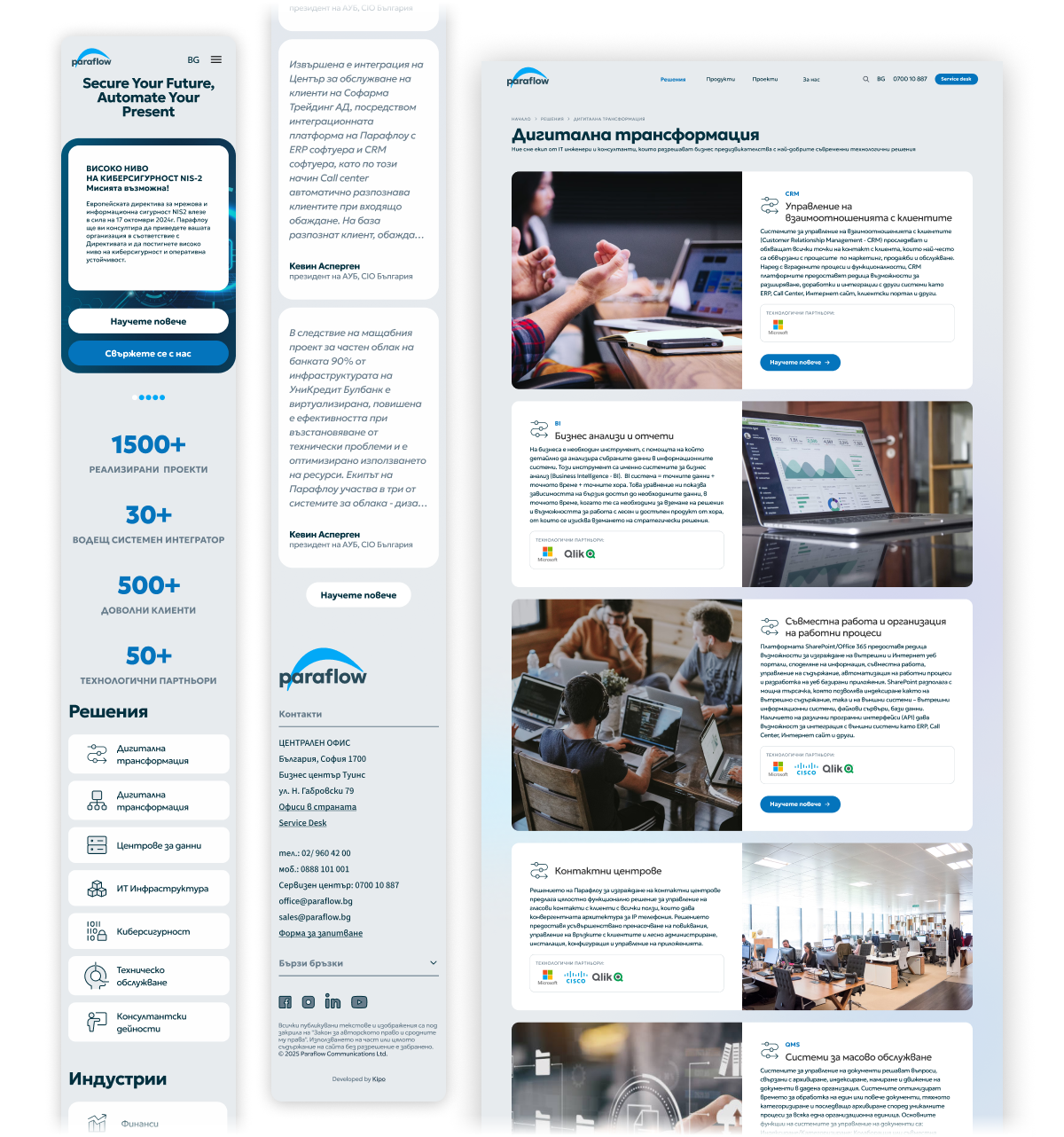 Podaraci.bgСъздадохме напълно custom корпоративен уебсайт за Paraflow Communications, един от водещите системни интегратори в България с над 25 години опит в ИТ сектора. Платформата е изградена върху Laravel, която разработихме така, че да позволява гъвкаво управление на динамично съдържание с комплексни връзки между услуги, индустрии, продукти и реализирани проекти.